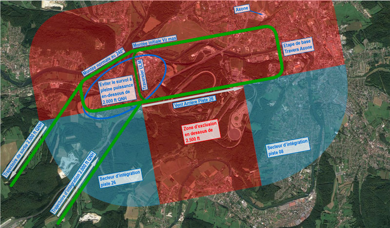 Dans le but de diminuer les nuisances sonores vis-à-vis de nos voisins de Voujeaucourt, et également afin d'améliorer la sécurité des vols aux abords de l'aérodrome de Montbéliard, nous vous proposons d'utiliser, dans la mesure du possible, les trajectoires proposées ci-dessous.